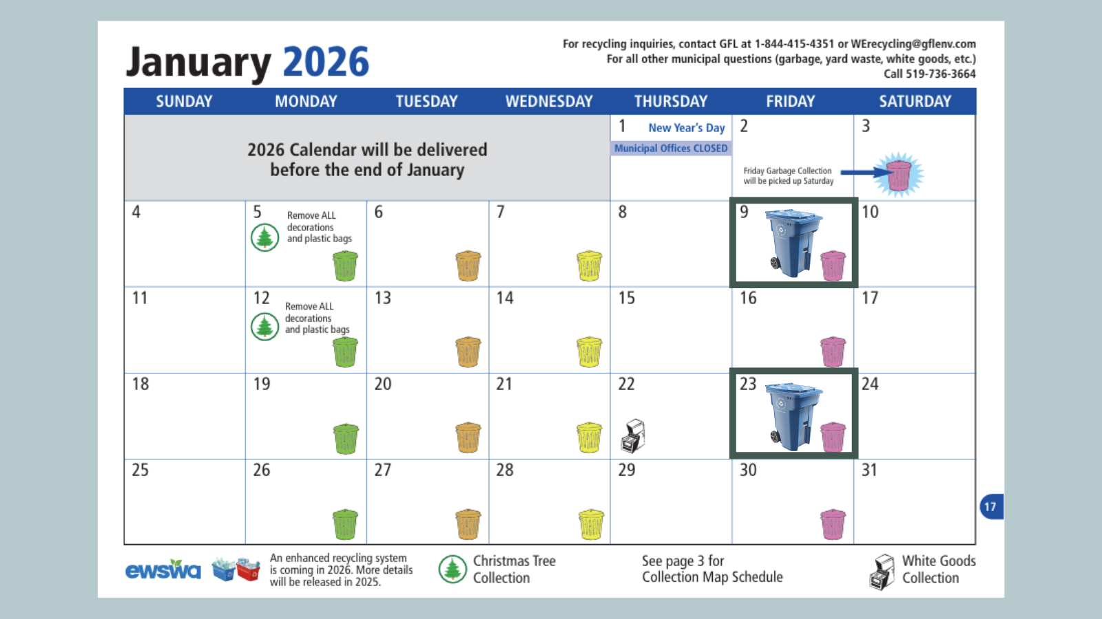 You may have noticed that our current Collection Calendar does not include January 2026 recycling dates due to the switch to the new single-stream recycling program managed by Circular Materials.