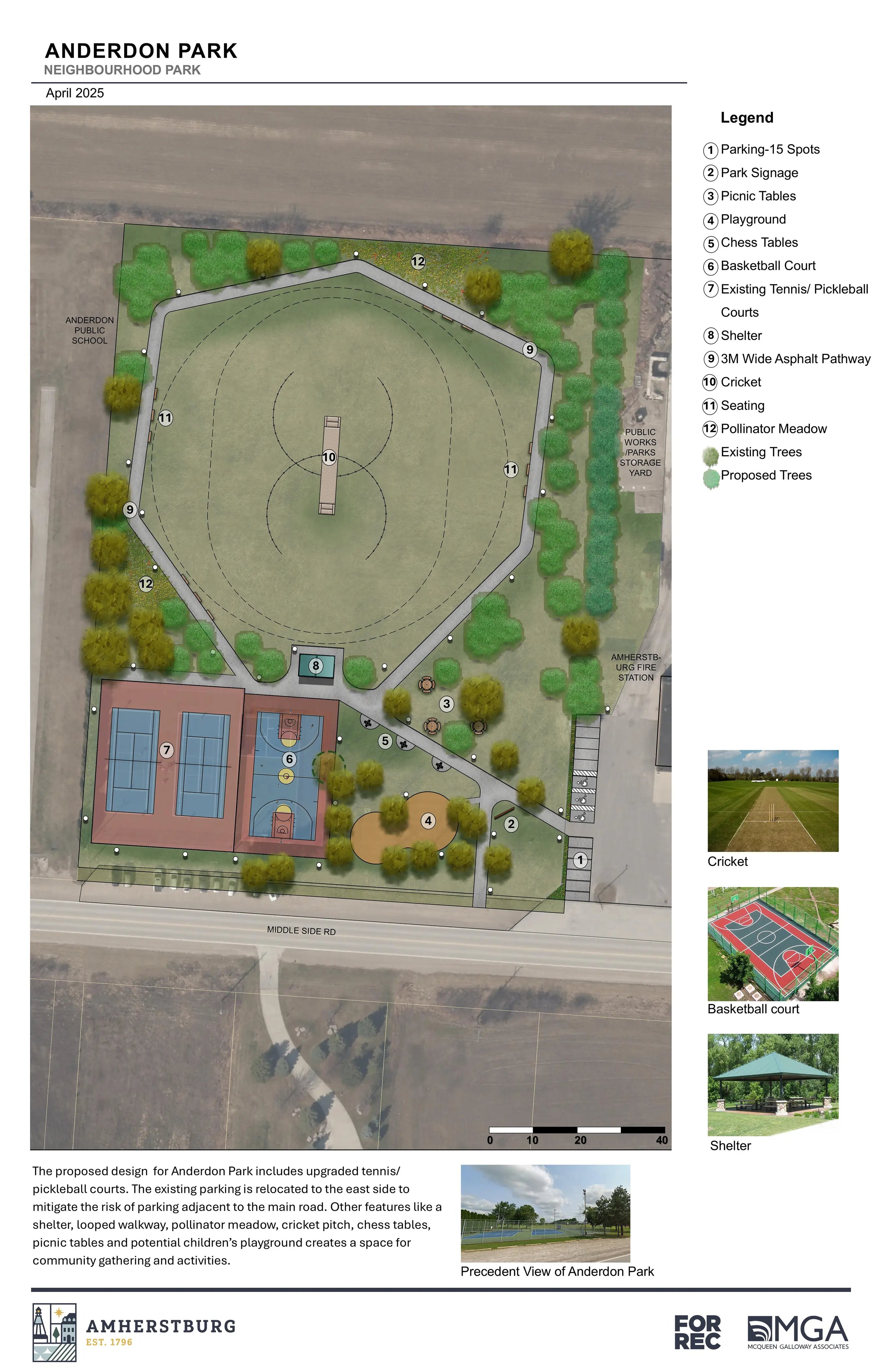 The attached Master Plan for this park shows the courts and cricket pitch along with proposed amenities, including a walking path, chess/checker tables, seating, trees and proposed playground.