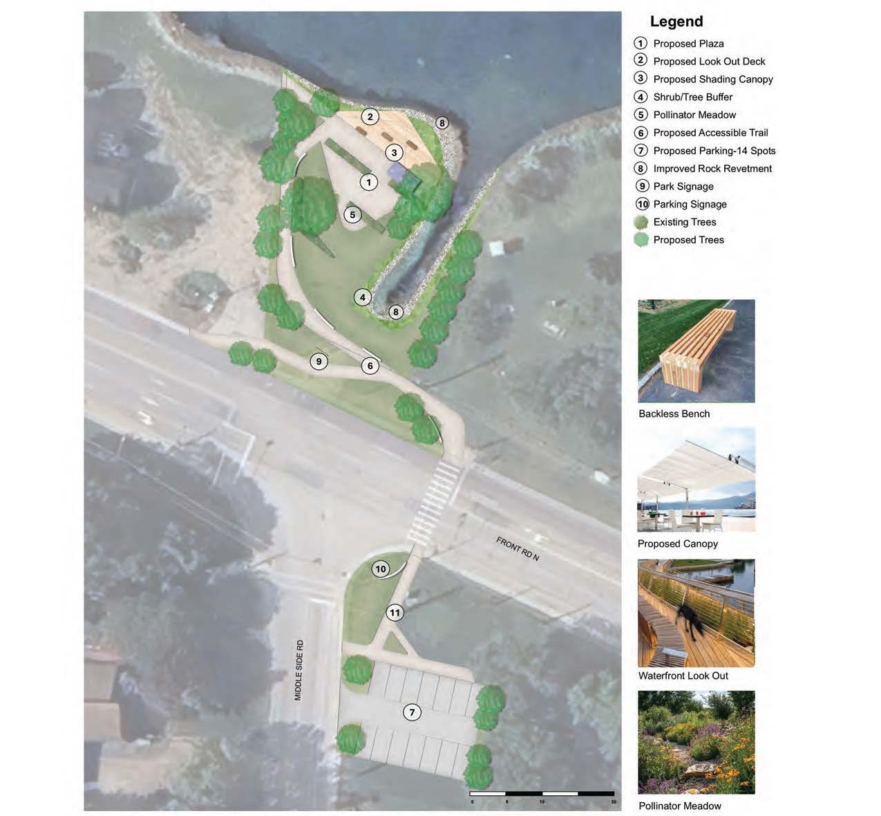 Parks Master Plan enhancements: A welcoming waterfront space with a scenic outlook featuring benches, shelter, and a flexible plaza for leisurely viewing the waterfront. Angstrom Park includes a pollinator meadow and native shoreline vegetation to enhance character, ecology, and safety. Interpretive signage shares Indigenous history of the site. Open lake views ensure clear sightlines. A striking, geometric park trail connects the waterfront to the parking lot across the road.