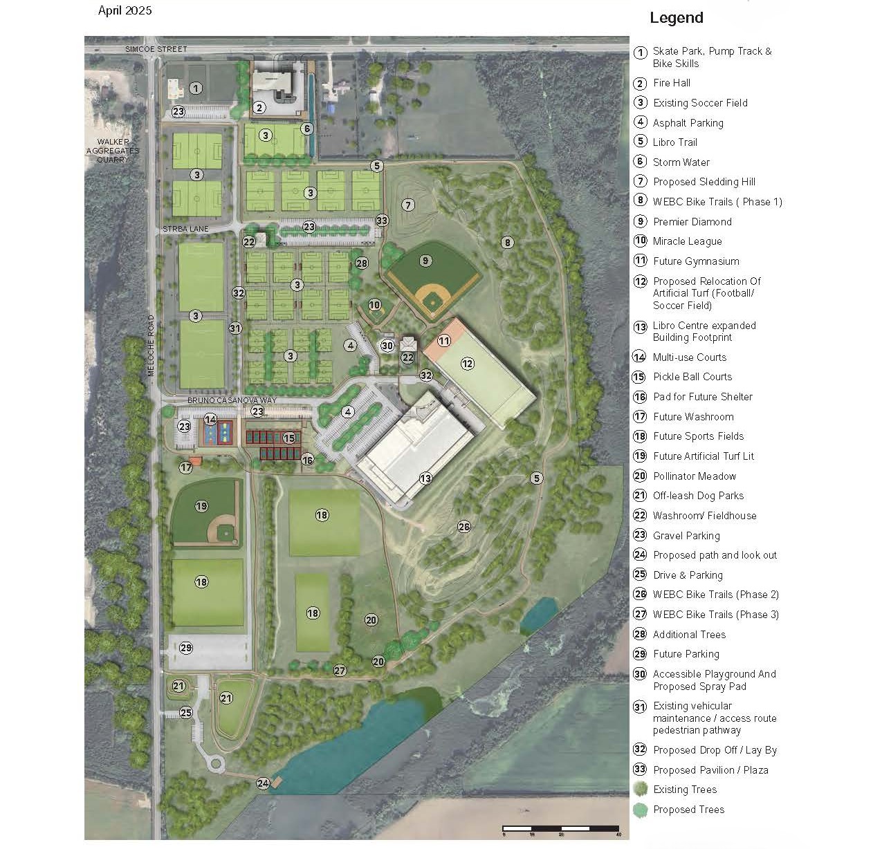 The northeast quadrant of the site has been approved to be the home of Amherstburg's new Fire Station. The northwest quadrant houses a skatepark with plans for a pump track and bike skills park. BMX trails and pathways were constructed in 2023, 2024 and 2025 by a local riding club, the Windsor Essex Bike Community (WEBC) that operates the trails through a unique land use agreement.