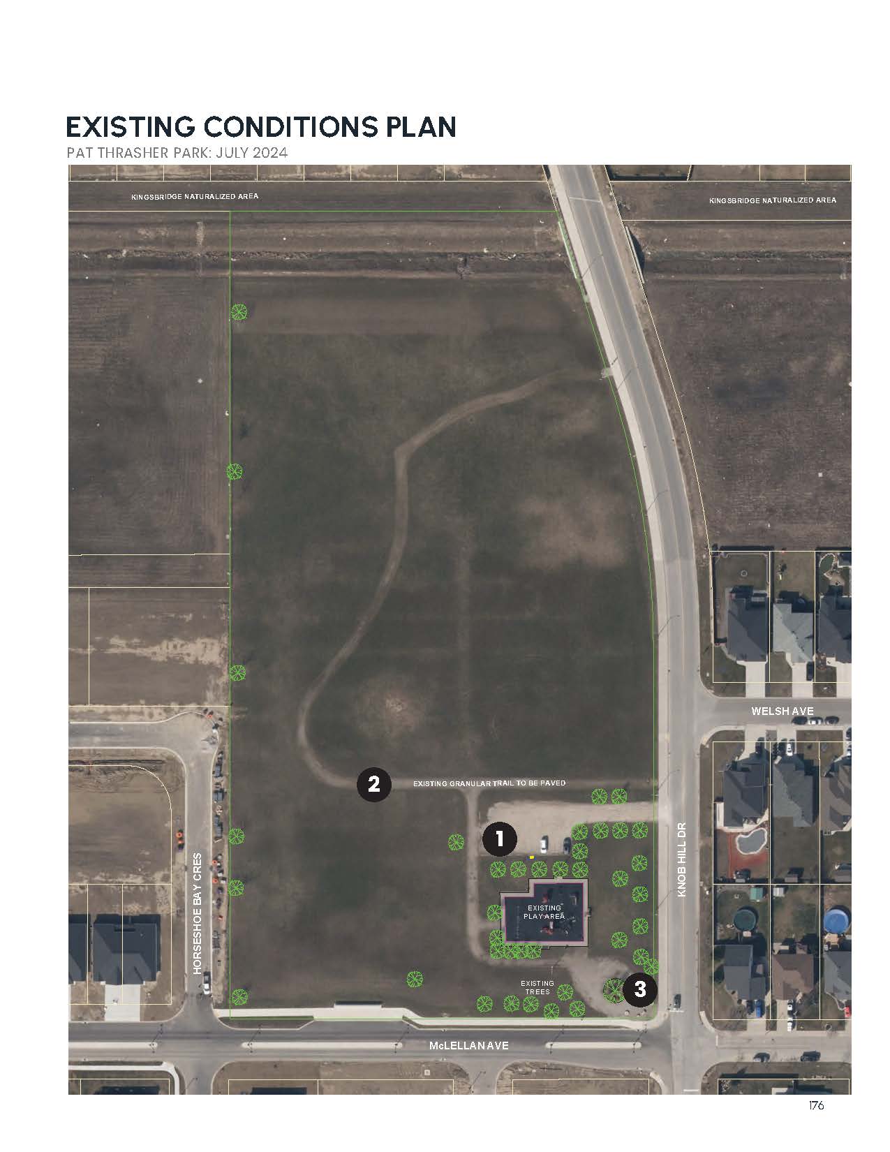 The design update reflects basketball multi-purpose courts, an Ultimate Frisbee field, a splashpad, and an off-leash dog park. Picnic tables, game tables, and park benches are distributed throughout. A central shelter and washrooms provide shade and convenience to families. Parking is expanded and relocated for convenience. A looped granular path connects park areas, trees and pollinator meadows will enhance the landscape. The park aims to be accessible, sustainable, and a hub for all ages to enjoy.