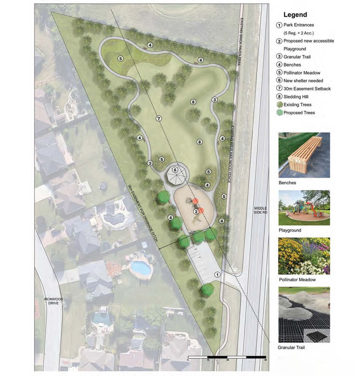 The image below shows the current park conditions and the final image shows the Proposed Approved Master Plan which will be implemented as funding permits.