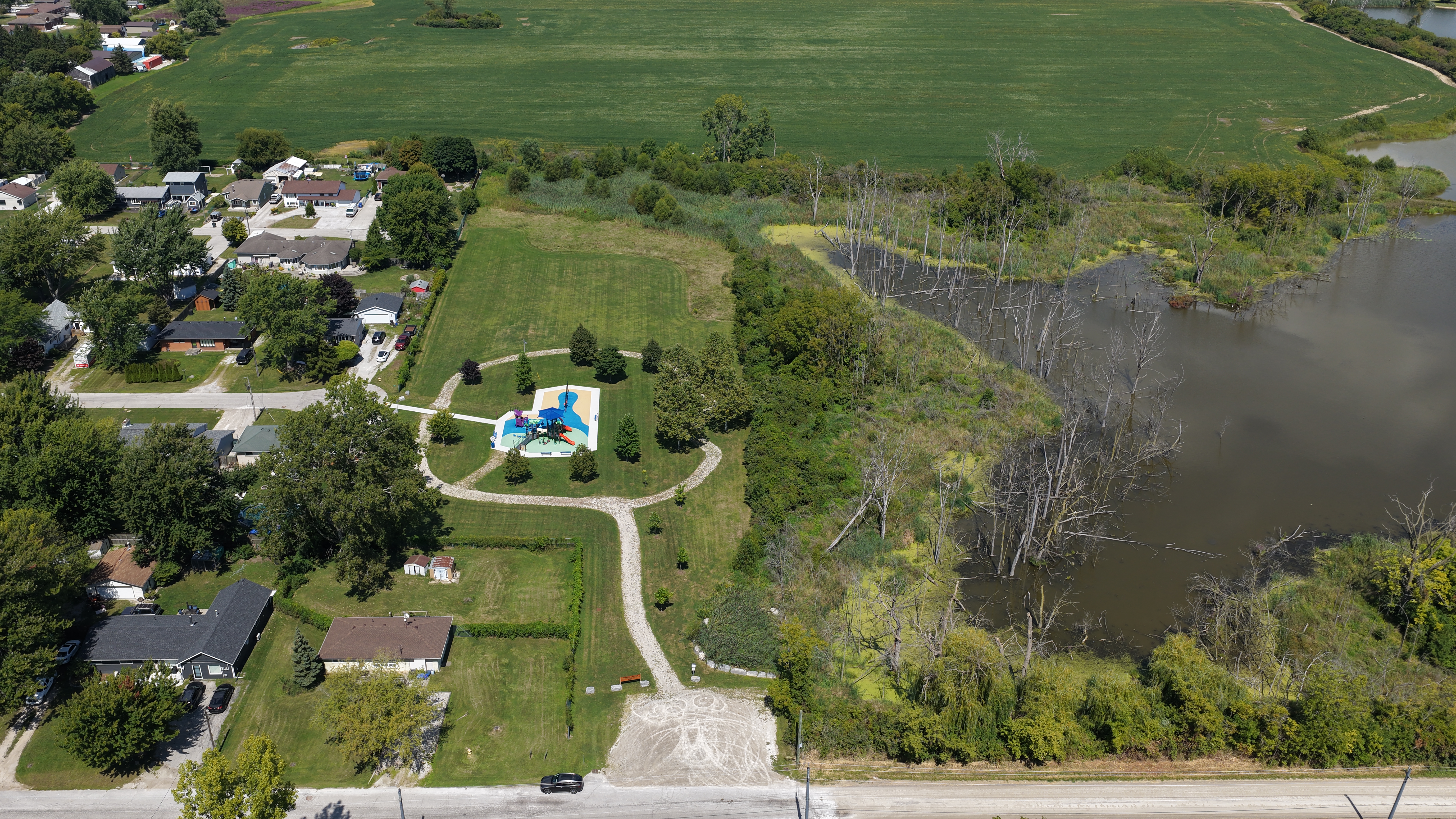 The park was developed as an eco-park after a grant was sough to fix drainage issues whereby rising water levels cause portions of the park to flood. This park abuts the Big Creek watershed making it home to many rare species of birds, flora and fauna, some not found anywhere else in Canada.